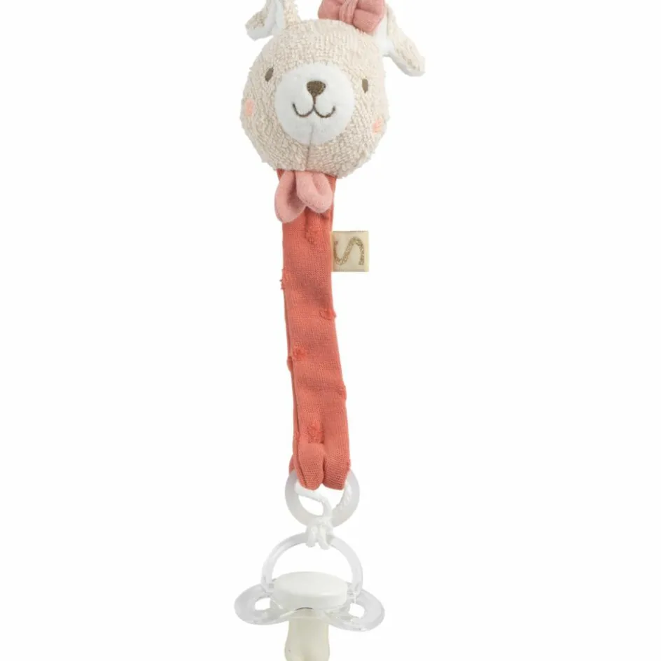 Avec sa douce tête de lapin équipée d’un grelot amusant, elle capte l’attention de bébé tout en gardant sa précieuse sucette à portée de main. Fini les tétines perdues ou qui tombent par terre lors des sorties ou à la maison ! Grâce à son système d’attache adapté aux tout-petits, elle se fixe facilement sans risque de pincement.