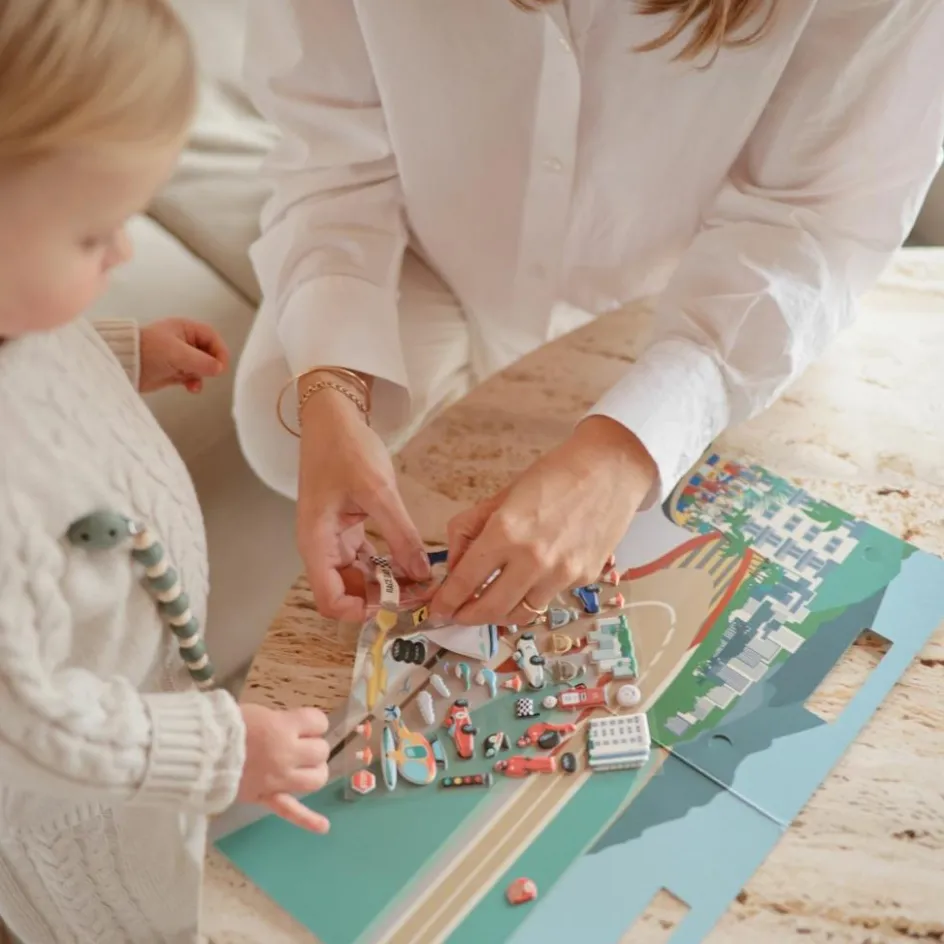 Prêt, feu, partez ! Avec le Sticker Book Race de Mushie, votre enfant plonge dans l’univers palpitant des voitures de course et des circuits effrénés. Un livre d’autocollants réutilisables qui donne vie à des scènes dynamiques, parfaites pour stimuler l’imaginaire et l’autonomie des petits passionnés de vitesse.