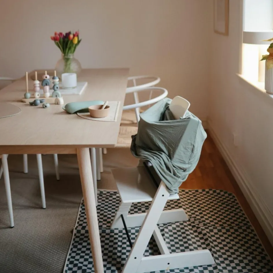 Protégez votre intérieur avec style grâce au tapis anti-éclaboussures Olive Check de Mushie, l’allié malin des repas et activités créatives de bébé !