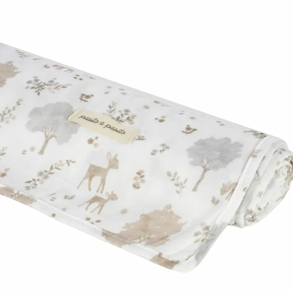 – Il comprend également un lange de 120×120 cm imprimée de cerfs et d’arbres dans des tons neutres, fabriqué à partir d’un mélange de 70% de bambou et de 30% de coton, offrant une texture ultra-légère, respirante et polyvalente, idéale pour câliner votre bébé, le protéger du soleil ou comme couverture légère à tout moment.