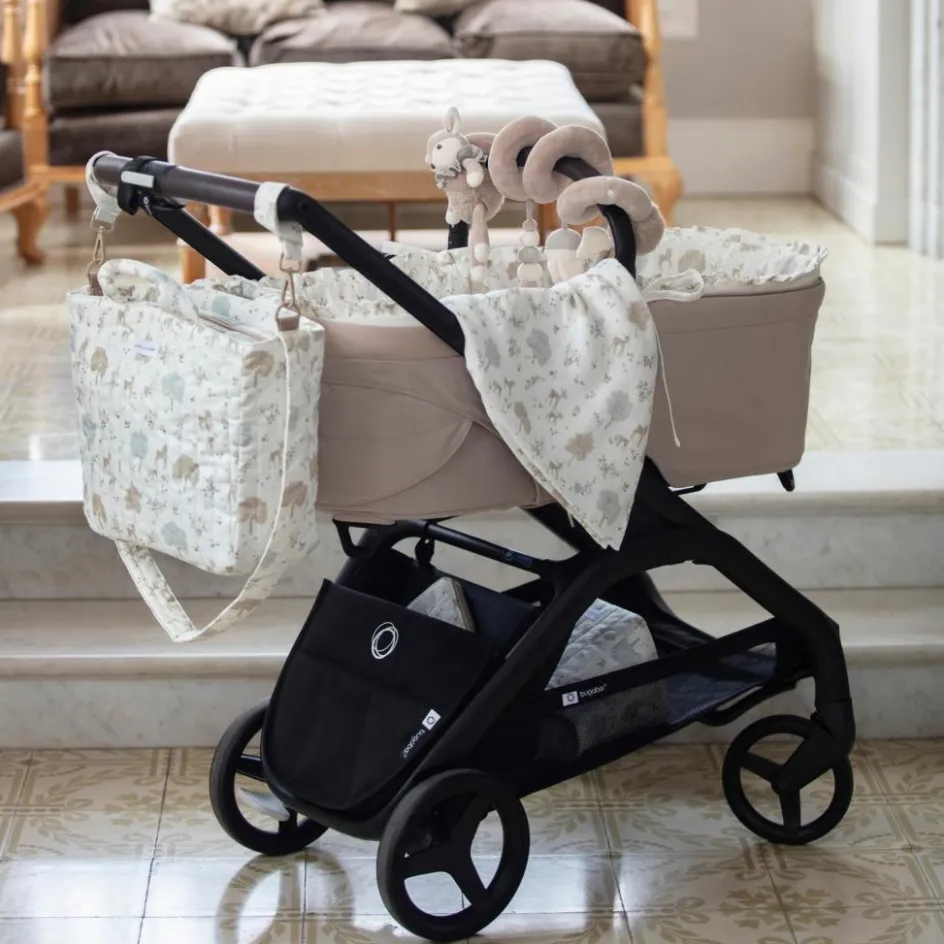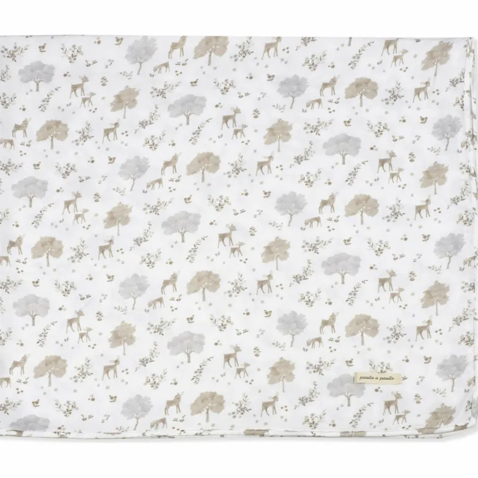 – Le lange Nara imprimé de cerfs et d’arbres dans des tons neutres par Pasito a Pasito est l’accessoire essentiel pour prendre soin de bébé.