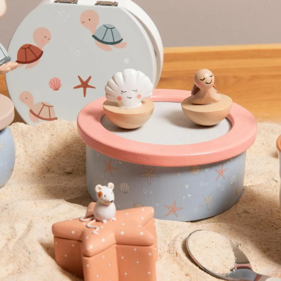Plongez dans un univers tendre et apaisant avec la boîte à musique Lulu, une création poétique signée Amadeus Les Petits. Inspirée du monde marin, cette boîte en bois aux tons pastel met en scène une adorable tortue et un coquillage souriant, qui tournent en rythme sur une douce mélodie. Son design délicat, parsemé d’étoiles de mer et de coquillages, en fait un objet décoratif aussi charmant qu’apaisant.