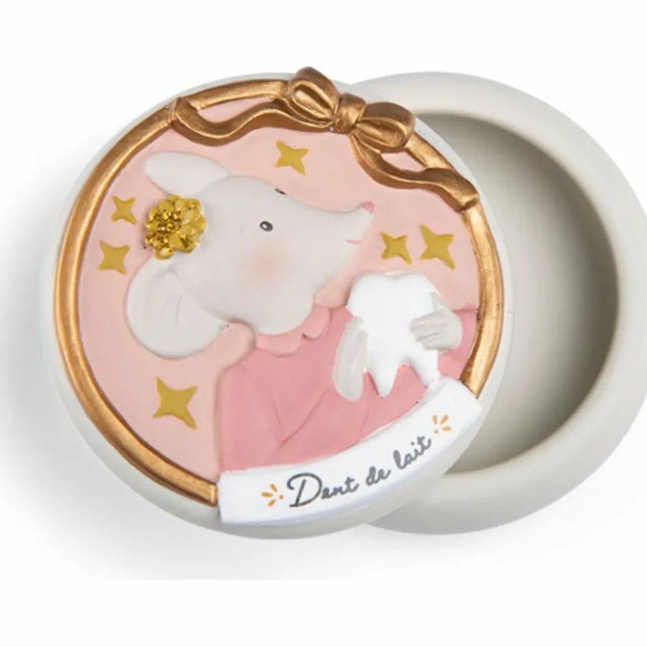 – Boîte dent de lait en résine aux couleurs de la gamme avec, en volume, le portrait d’une petite souris qui conservera précieusement les premières dents de l’enfant.