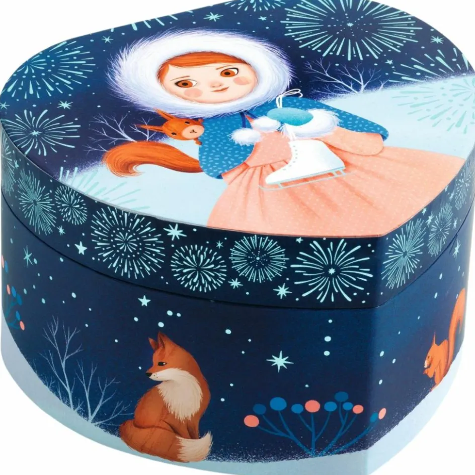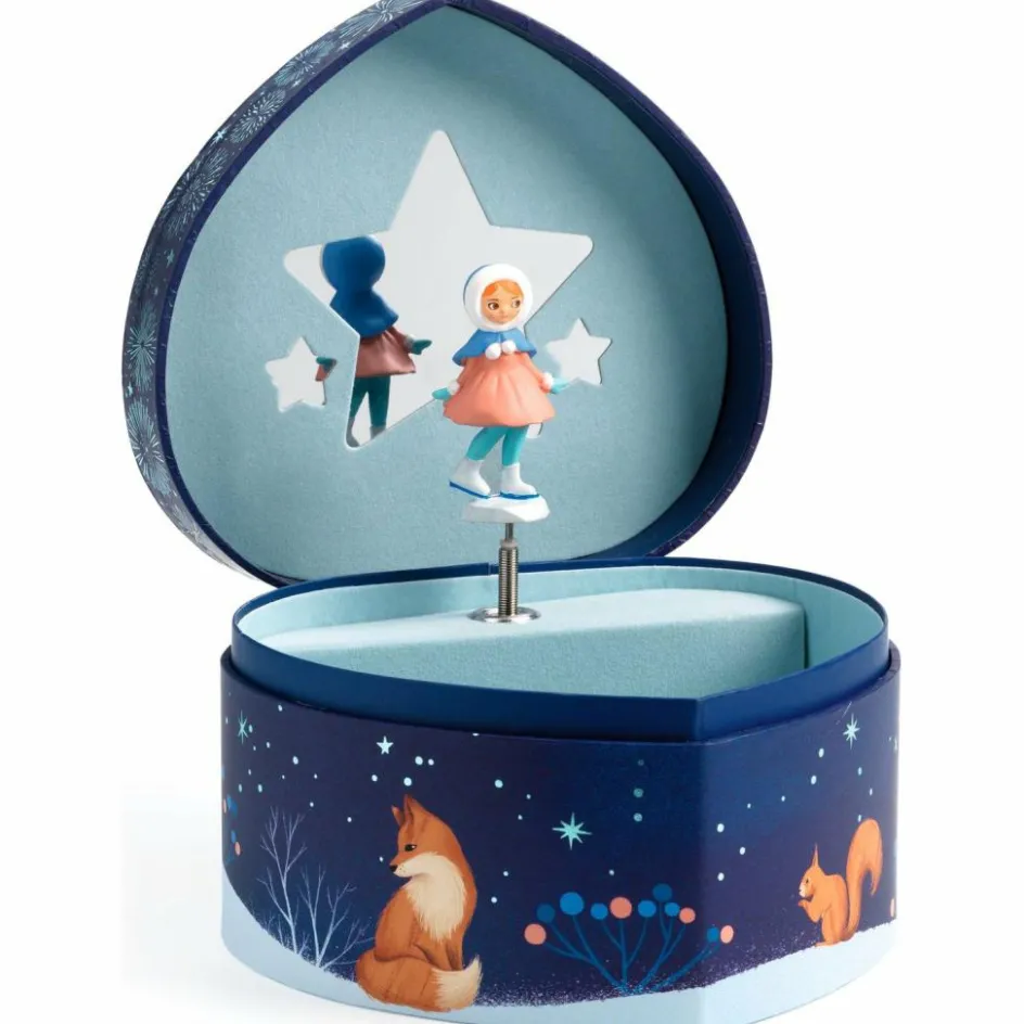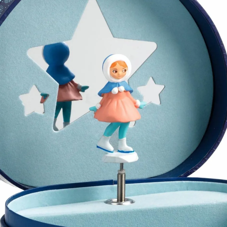 Patineuse est une boîte à musique en forme de cœur joliment illustrée pour ranger ses bijoux et secrets. Tournez la manivelle, ouvrez la boîte, et surprise ! Une patineuse finement sculptée tourne et se reflète sur un miroir silhouetté au son de la musique « Let me call you sweetheart » de Leo Friedman.