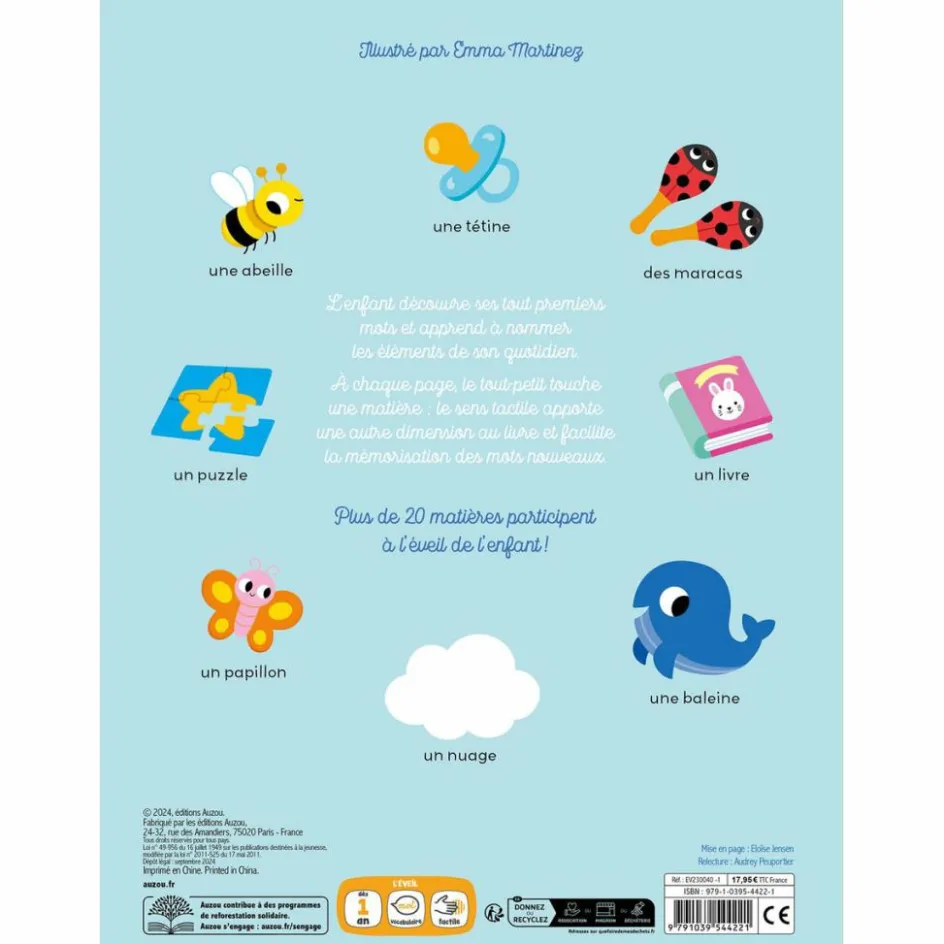 – Plus de 20 matières à toucher qui permettent aux petits d’appréhender une nouvelle dimension des objets et mots présentés.