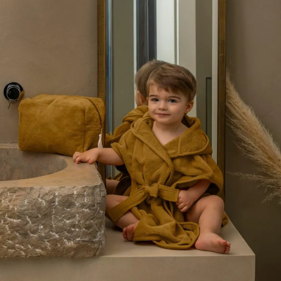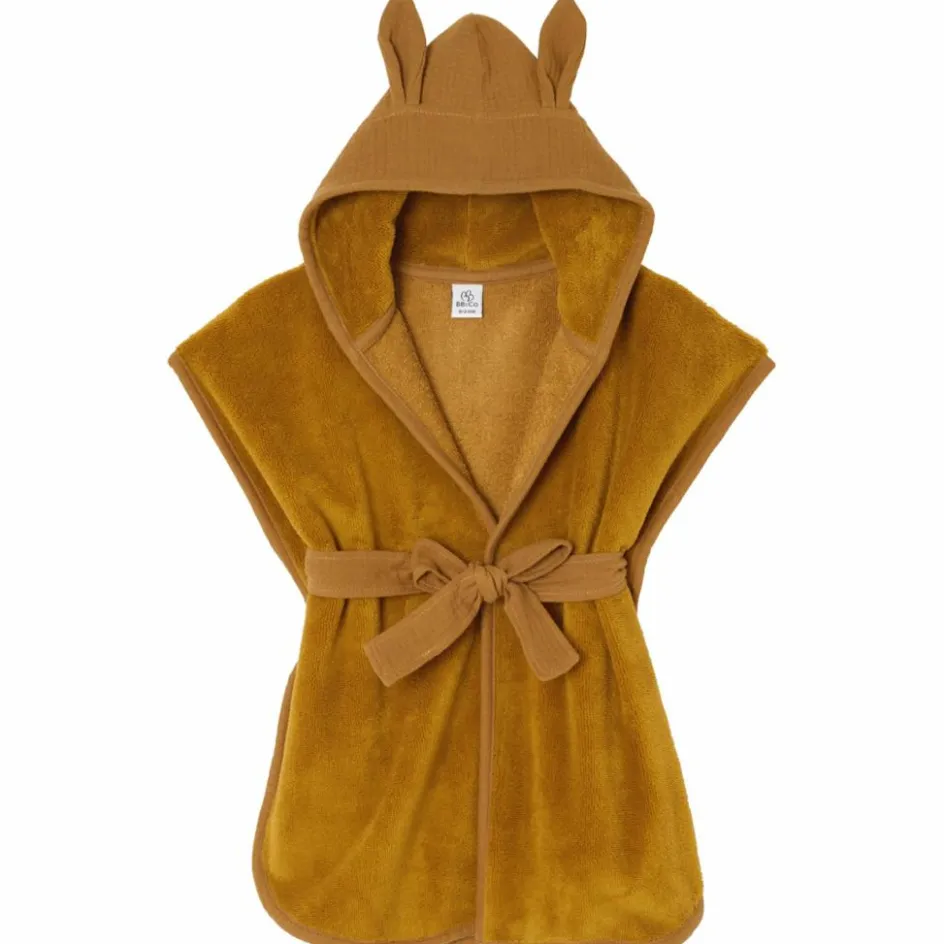 – Un adorable peignoir en éponge bambou avec capuche et ceinture en double gaze de coton.