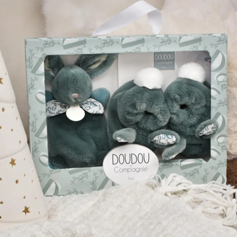 New Doudou et Compagnie Coffret Chaussons et Doudou Vert Sauge Lapin Doudou