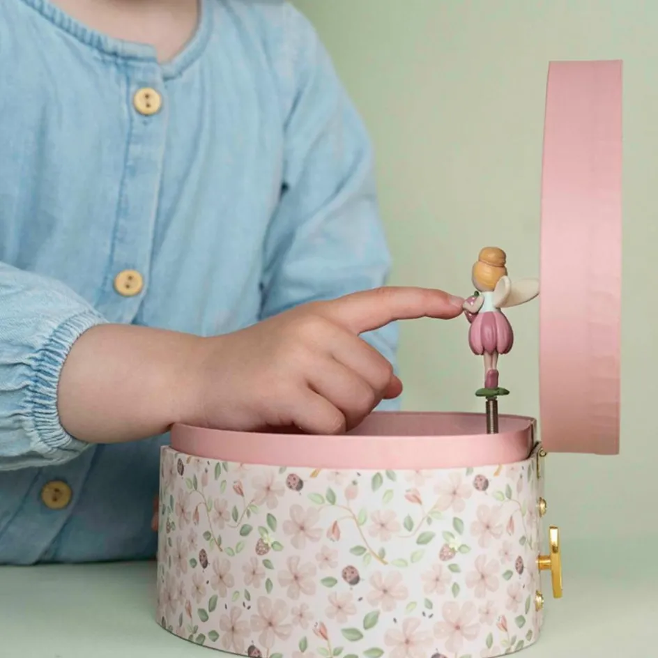– Lorsque la boîte s’ouvre, une musique retentit tandis qu’une fée danse devant le miroir.