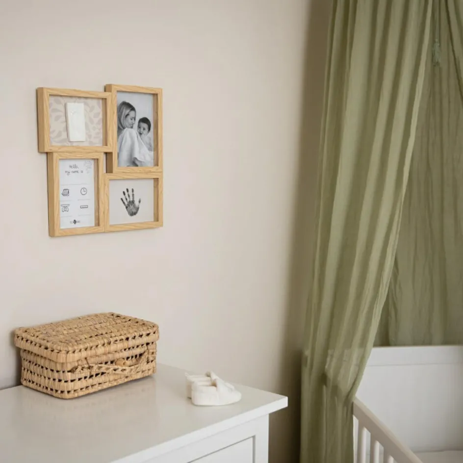 – Il est accompagné d’une affiche pour y inscrire toutes les informations de naissance : prénom, poids, taille, ainsi que l’heure et le jour de l’arrivée de bébé! Le fond des cadres est personnalisable avec un arrière plan au motif végétal ou de couleur unie beige.