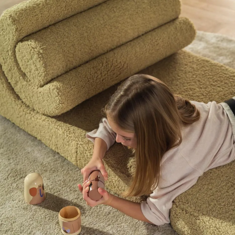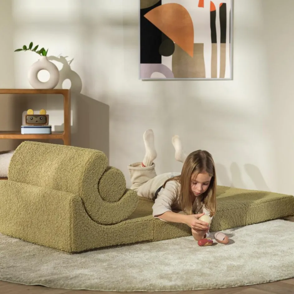 Pensée comme un véritable compagnon du quotidien, cette chauffeuse modulable séduit par sa texture molletonnée façon « teddy », ultra réconfortante, et son coloris matcha tout en douceur. À la fois fauteuil, lit d’appoint et terrain de jeu, elle suit les envies de votre enfant à tout moment de la journée.