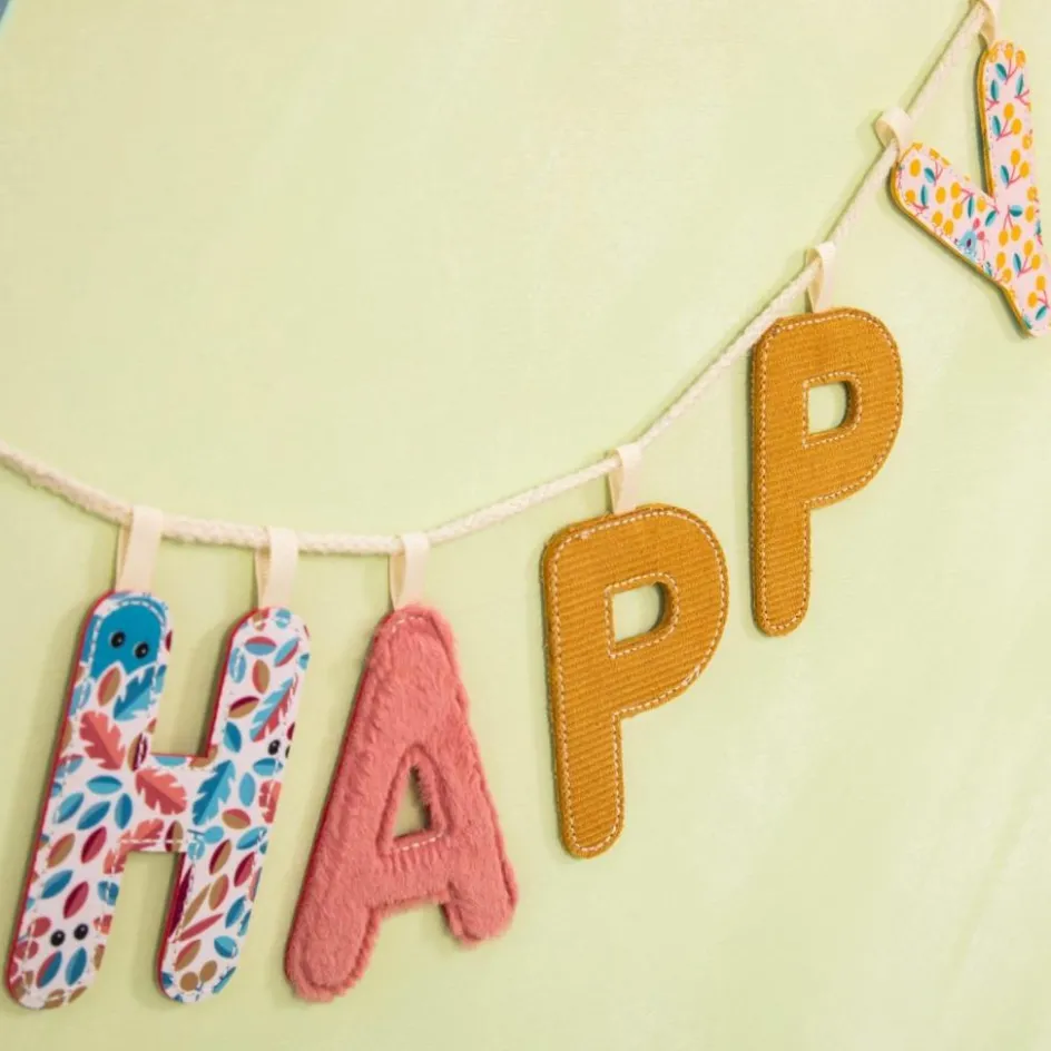 – Accrocher les lettres en tissu Lilliputiens pour former une guirlande personnalisée.