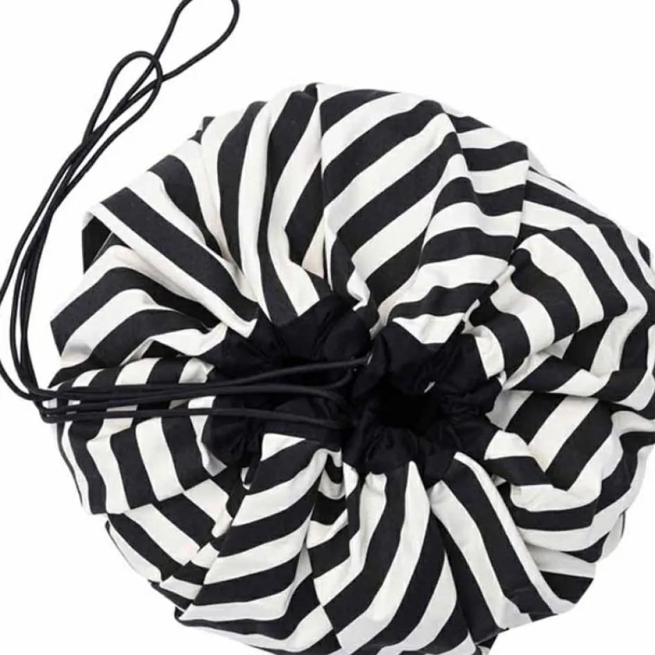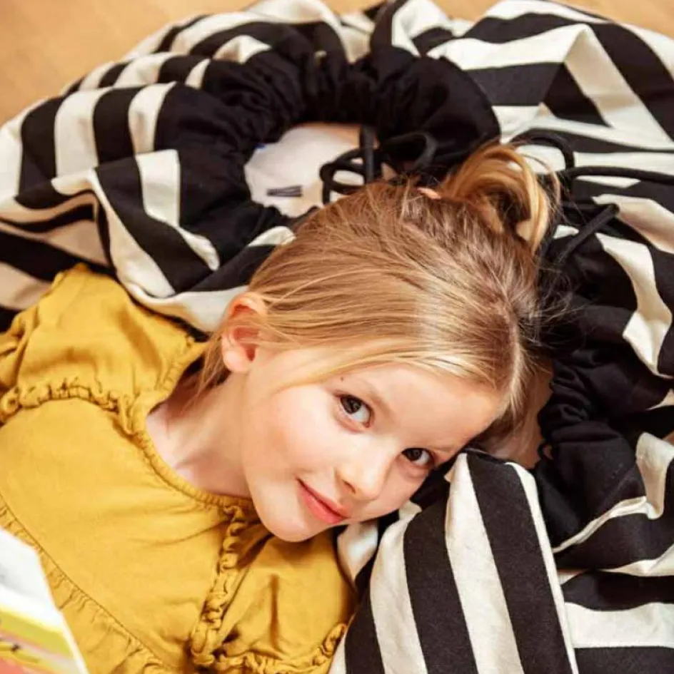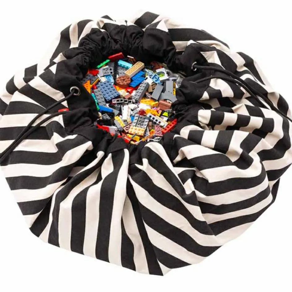 Le sac à jouets 2 en 1 Rayures noires de la marque Play&Go permet de transporter facilement les jouets d’une pièce à l’autre ou même hors de la maison. Confectionné en tissu résistant, il devient un tapis de jeu lorsqu’on desserre les liens. Dès que l’enfant a fini de jouer, il suffit de serrer à nouveau les liens et tout est déjà rangé !