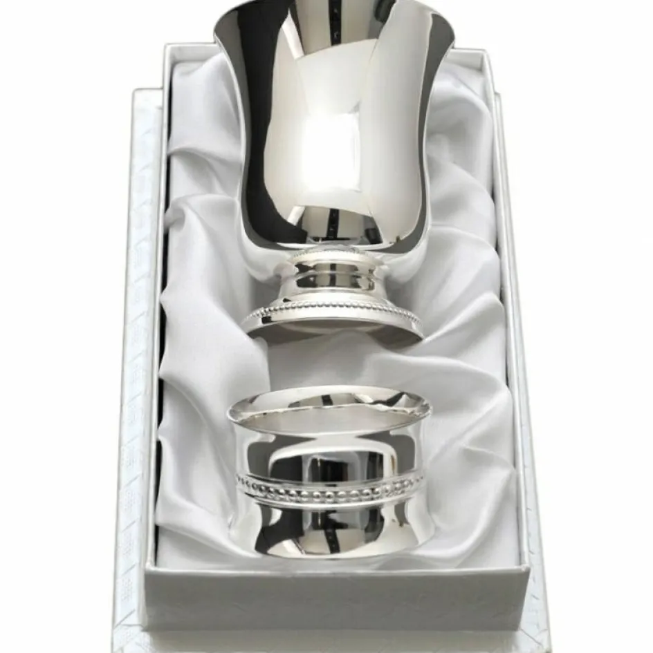 Pour que la table de votre enfant soit élégante et raffinée, voici la timbale et le rond de serviette Perles par l’Orfévrerie de Crévigny.