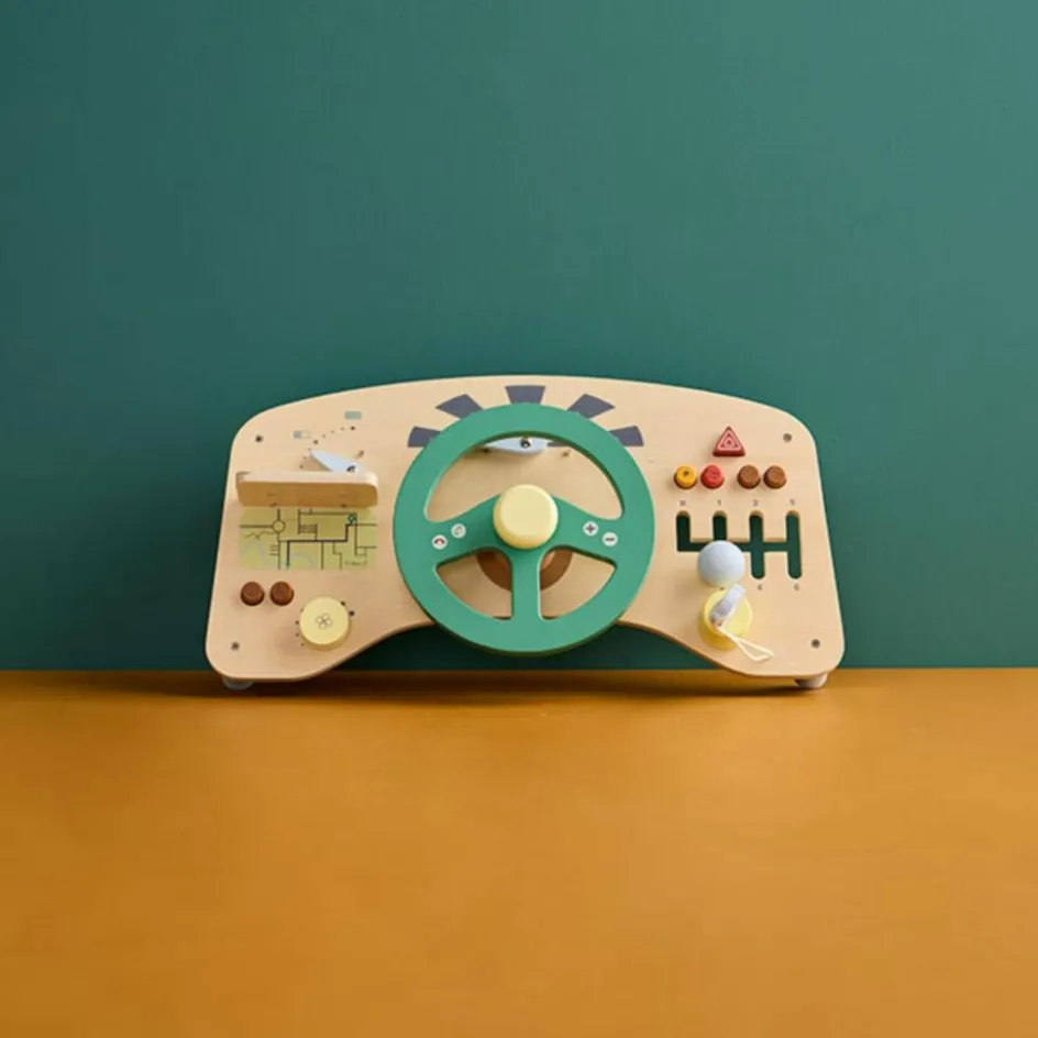 Ce tableau de conduite en bois certifié FSC transforme le jeu en une expérience immersive et éducative. Avec son volant à tourner, sa clé pour « démarrer », son GPS illustré et son klaxon intégré, il invite les enfants à s’imaginer au volant de leur propre voiture électrique. Les boutons-poussoirs, le compteur de vitesse et l’indicateur de batterie enrichissent le réalisme et stimulent la curiosité des petits conducteurs.